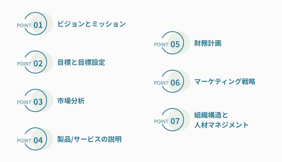 以下は、事業計画の基本的な構成要素です。これらを踏まえた事業計画を作成することで、組織の方針や目標を達成するためのロードマップが完成します。