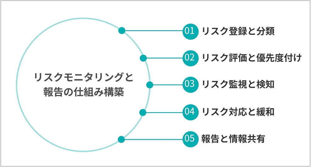 リスクの動向を監視し、早期に問題を検知する仕組みを構築します。定期的なレビューや報告体制の整備、および適切な情報共有が重要です。 - リスク対応と緩和