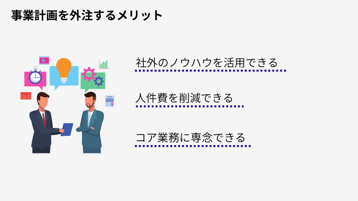 事業計画を外注することで、自社では得られない専門的な知見や効率的なリソース配分が可能になります。外部の力を借りることで、計画の完成度を高めるだけでなく、内部リソースの負担を軽減する効果も期待できます。ここでは、外注による具体的なメリットを3つに分けて解説します。