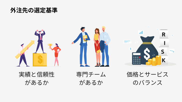 外注先を選ぶ際には、いくつかのポイントがありますが、特に押さえておくべき基準としては、以下の3つが挙げられます。