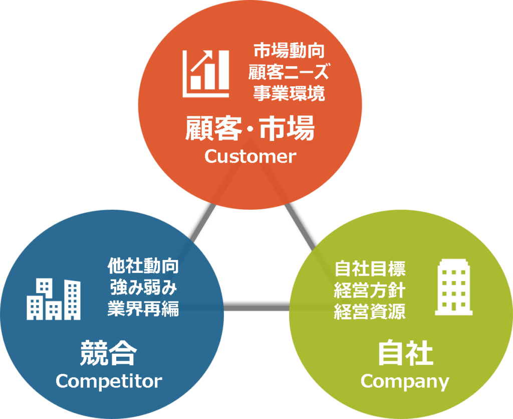 「3C分析」はバランスのよい経営戦略を、顧客目線で立てていくためのフレームワークで、以下の3つの要素にわけ、分析していきます。顧客に対する、自社プロダクトの競争優位性を見出すことが目的の場合、このフレームワークの活用をおすすめします。