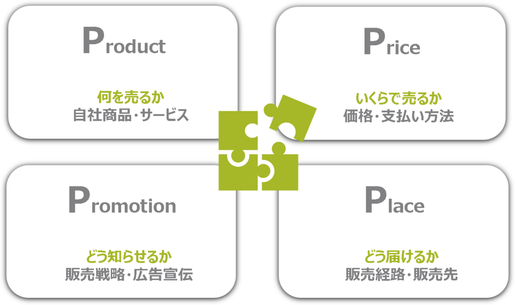 企業目線で考えていく「4P分析」は1960年に提唱されたフレームワークで、以下の4つにわけ、要素を列挙していきます。