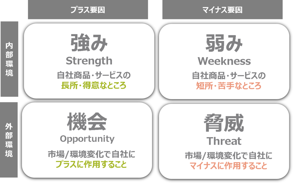 簡単にいうと、自社の商品・サービスの強みや弱みを整理・集約し、外部環境と照らし合わすフレームワークで、マーケティング戦略を練る際に適しています。