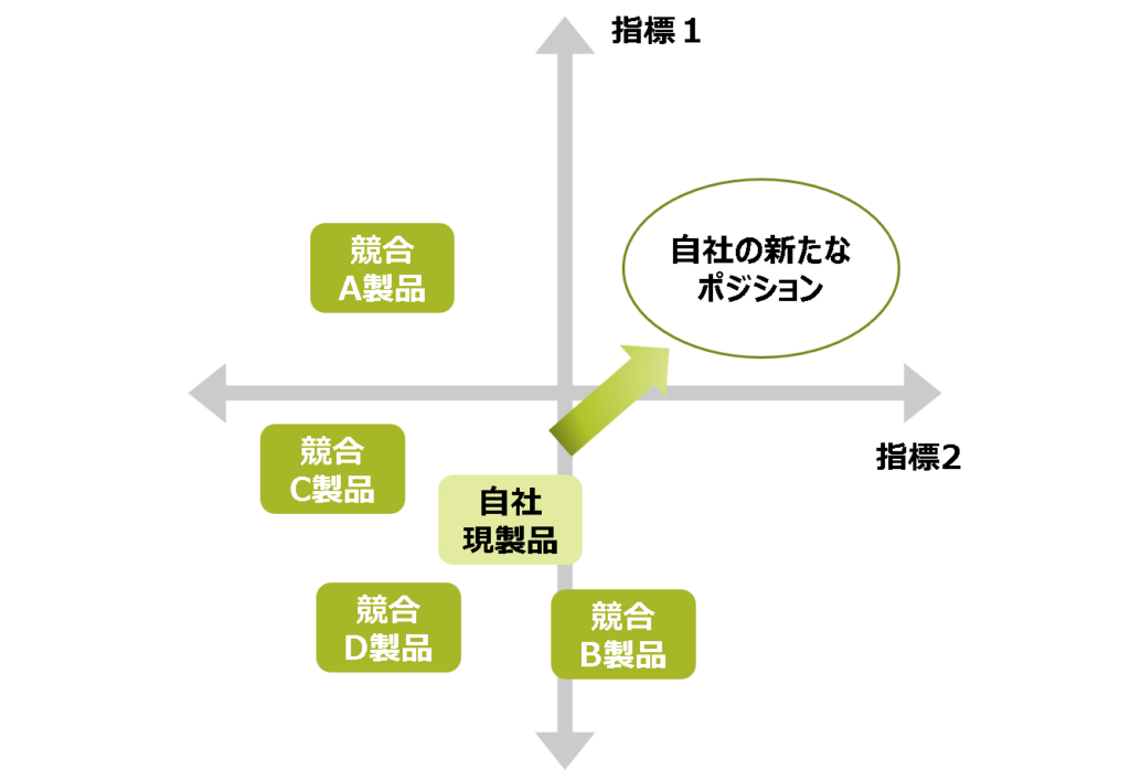 「ポジショニングマップ」は、市場での自社の立ち位置を見定める際に有効なフレームワークです。競合他社の製品やサービスが、どのような立ち位置にあり、自社がどの位置を目指すのかを明確にすることができます。