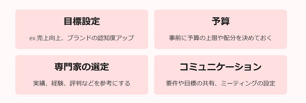 マーケティング施策の成功には、適切な専門家の選択が欠かせません。外部の専門家へ依頼する際には、以下のポイントに合致しているかを確認し、選ぶことをおすすめします。
