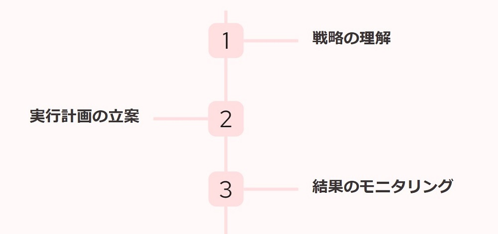 なお、マーケティングの手法には「有料広告の出稿・ブログの執筆・SNS運営・動画作成・プレスリリースを出す」などいろいろなものがありますが、手段先行にならず、目的に沿った手段を採る必要があります。
