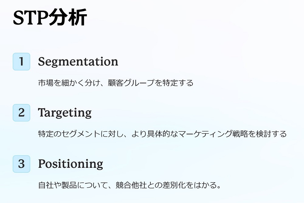 このフレームワークでは、セグメンテーション(Segmentation)、ターゲティング(Targeting)、ポジショニング(Positioning)の頭文字の順に思考していきます。