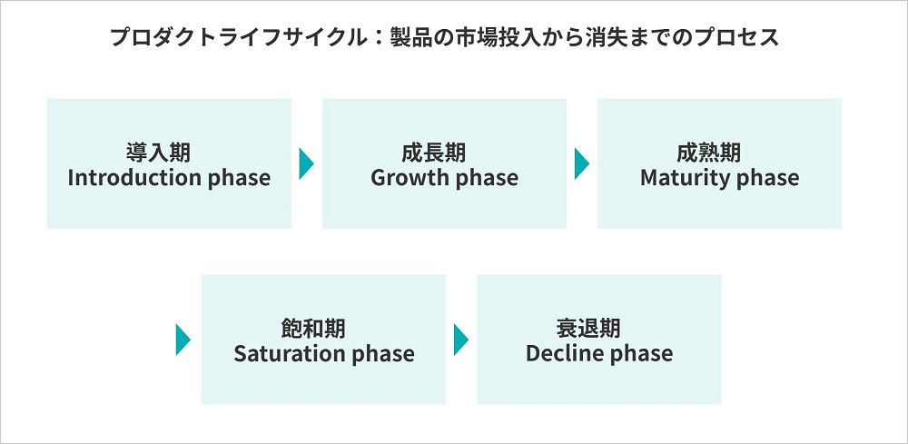 プロダクトライフサイクル(Product Life Cycle)とは、製品が市場にリリースされた、成長段階を踏み、その後消失するまでの過程のことです。消費者の需要は時間の流れとともに 導入期(Introduction phase)、成長期(Growth phase)、成熟期(Maturity phase)、飽和期(Saturation phase)、衰退期(Decline phase)と進行していきます。