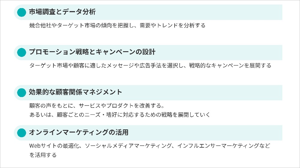 ただし、取り扱う商品やサービス、業界・業種、さらにはトレンドによっても、適切なやり方は異なります。そのため、可能であれば戦略立案の段階から、マーケティング領域に詳しい専門家をメンバーに加え、自社に合うマーケティング活動を行うことをおすすめします。詳しくは下記の記事も参考にしてみてください。