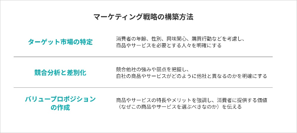 このように、マーケティング戦略の構築にはターゲット市場の特定、競合分析と差別化、独自のバリュープロポジションの作成が欠かせません。これらの要素を考慮しながら、効果的なマーケティング戦略を構築しましょう。