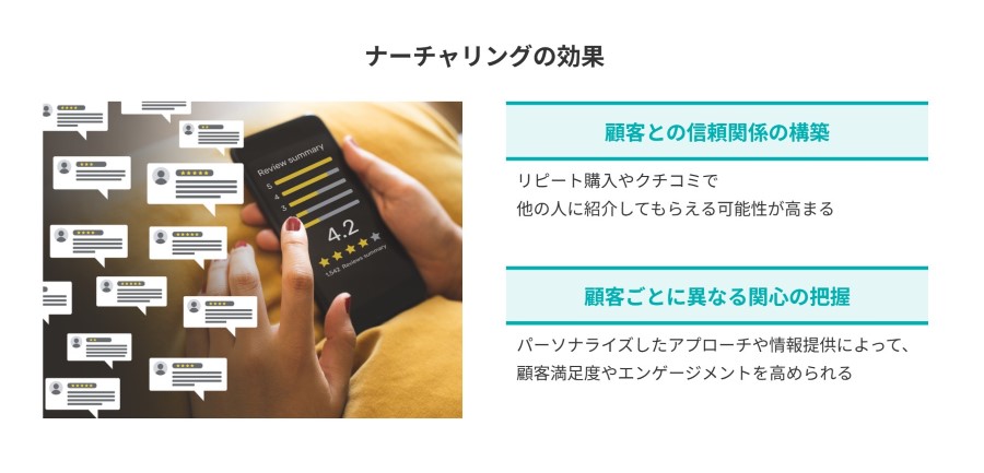 ナーチャリングは、顧客との信頼関係を構築するための効果的な手段です。顧客の自社への信頼度が増せば、リピート購入やクチコミで他の人に紹介してもらえる可能性が高まります。