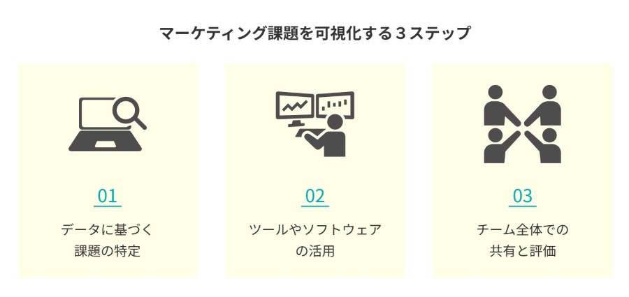 マーケティングの課題を可視化するためには、以下の3つのステップを踏むことが重要です。
