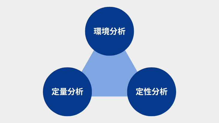 マーケティング課題を正確に特定するためには、様々な分析方法を組み合わせることが重要です。以下では、環境分析、定量分析、定性分析の3つの主要な方法について簡潔に解説します。