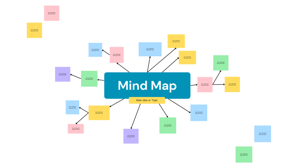マインドマップは、中心テーマから放射状に連想を広げていく発想法です。テーマに関連する単語を枝のようにつなげていき、自由に思考を展開させるのが特徴です。