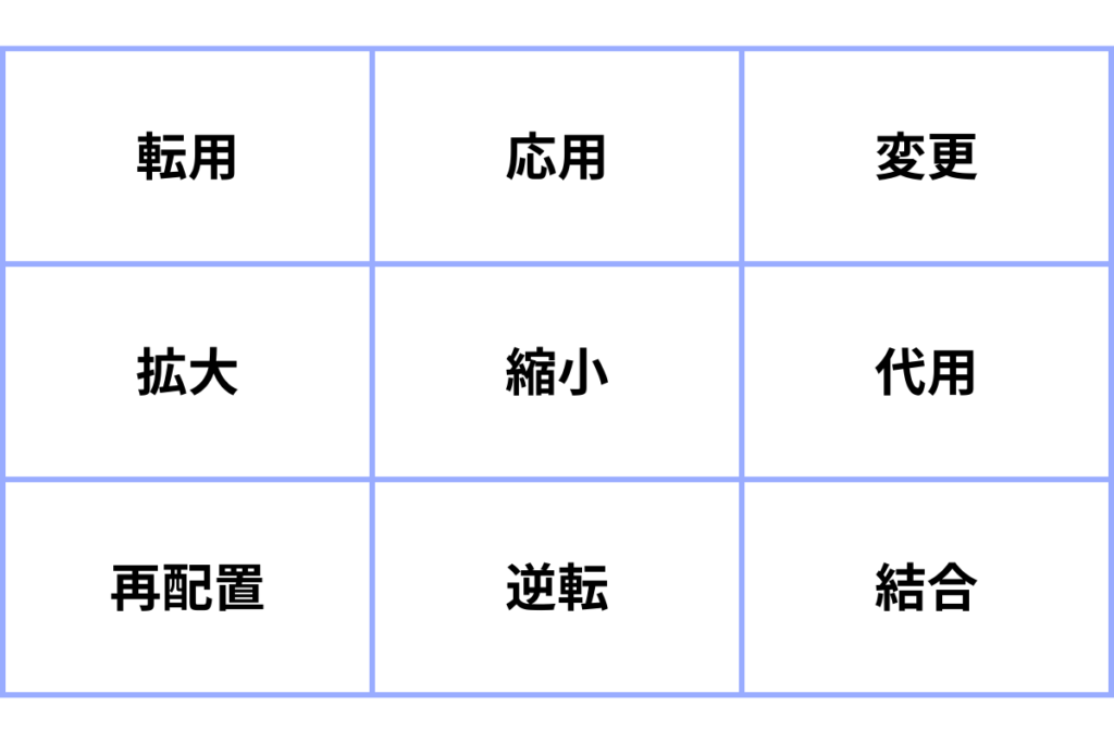 オズボーンのチェックリストは、アイデアをブラッシュアップする際のガイドラインとなる質問集です。「他の用途は?」「拡大・縮小は?」「逆さまにすると?」など、アイデアを異なる角度から見直すための9つの問いが用意されています。