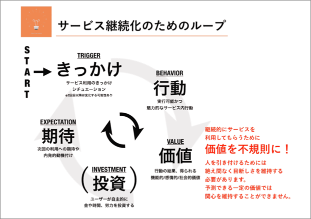 ヒットし続けるサービスを開発するためには、1周目でのユーザーの獲得だけで満足せず、2周目も十分に設計し、何度も利用されるような「きっかけ」をデザインすることが重要です。