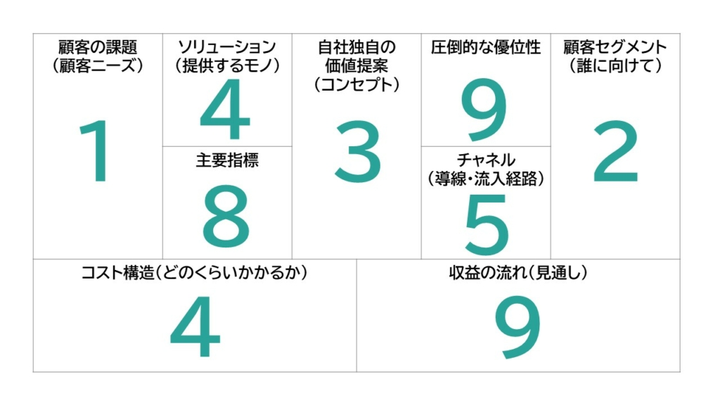ビジネスモデルキャンバスは、新規事業の全体像を俯瞰するためのフレームワークです。顧客セグメント、価値提案、チャネル、顧客関係、収益の流れ、リソース、活動、パートナー、コスト構造の9つの要素から事業を設計します。