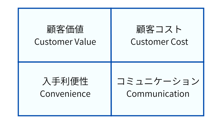 4C分析は、顧客視点に立った事業内容構築を目指すフレームワークです。Customer Value(顧客価値)、Cost to the Customer(顧客コスト)、Convenience(利便性)、Communication(コミュニケーション)の4つの視点で分析を行います。