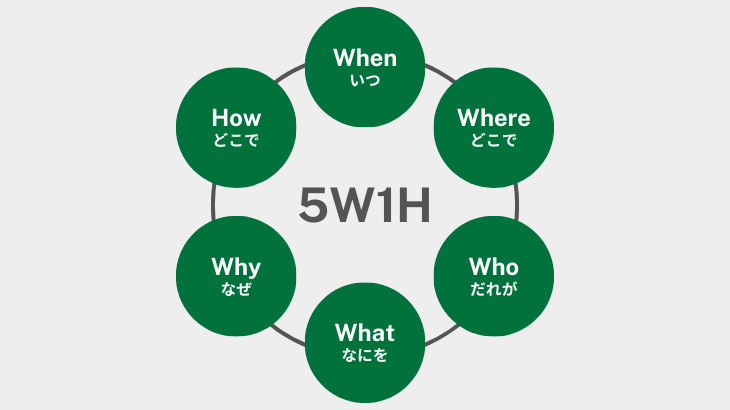 5W1Hは、Who(誰)、What(何を)、Where(どこで)、When(いつ)、Why(なぜ)、**How(どうやって)**の6つの質問に答えることで、物事を多角的に考えるためのフレームワークです。