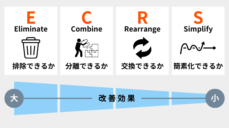 ECRSは、Eliminate(排除)、Combine(結合)、Rearrange(再配置)、Simplify(簡素化)の4つの視点から業務プロセスを見直すフレームワークです。業務の効率化やコスト削減を目的として用いられます。