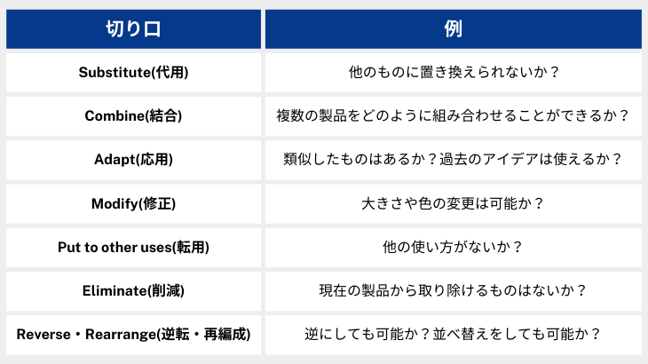 このフレームワークは、既存の製品やサービスの改良案を考えたいときに特に有効です。たとえば、「既存の機能を他の素材で代用したらどうなるか?」や、「全く異なる市場に転用できないか?」といった質問を通じて、新しい価値を創出できます。製品開発やマーケティング戦略の立案など、幅広い場面で活用可能です。