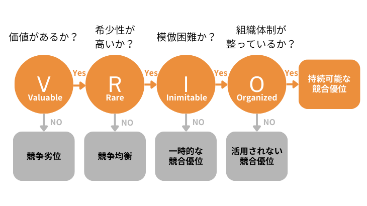 このフレームワークは、内部リソースを効果的に活用して差別化を図りたいときに役立ちます。たとえば、自社独自の技術やブランドが市場でどの程度の競争力を持つのかを評価し、事業戦略に活かせます。