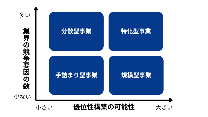 このフレームワークは、競争の激しい市場で差別化を図るために適しています。たとえば、競合がターゲットとしていないニッチ市場を探し、そこに特化した新規事業を展開する、といった具体的な施策を考える際に役立ちます。
