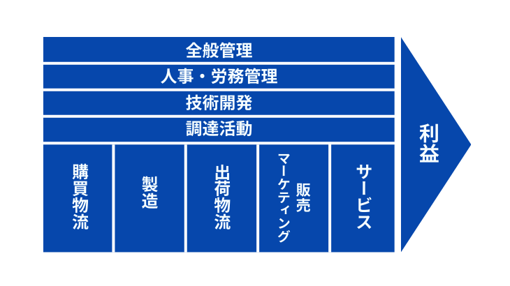 バリューチェーン分析は、事業活動を**主活動(物流、製造、販売など)と支援活動(調達、技術開発、人事・労務管理など)に分け、それぞれのプロセスがどのように付加価値を生み出しているかを分析するフレームワークです。