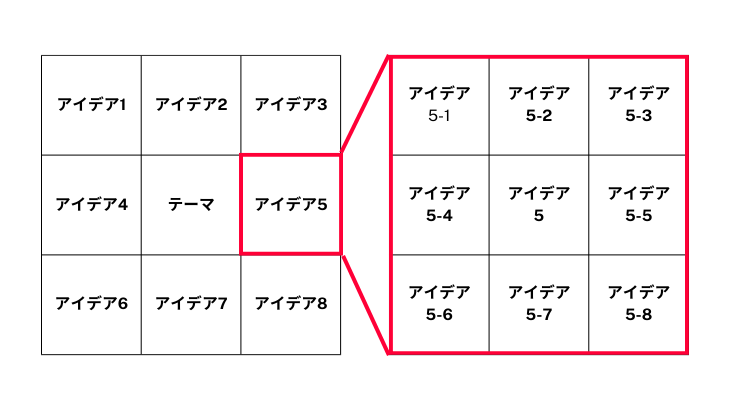 マンダラートは、中心にテーマを置き、それに関連するアイデアを周囲に展開していくフレームワークです。最終的には9×9のグリッドに関連アイデアを埋めていき、発想を広げていきます。