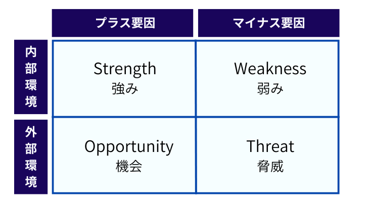 SWOT分析は、自社のStrengths(強み)、Weaknesses(弱み)、Opportunities(機会)、Threats(脅威)を整理し、戦略を立てるためのフレームワークです。内部環境(強み・弱み)と外部環境(機会・脅威)を区別し、それぞれを評価することで、自社が市場で取るべき行動を明確にします。