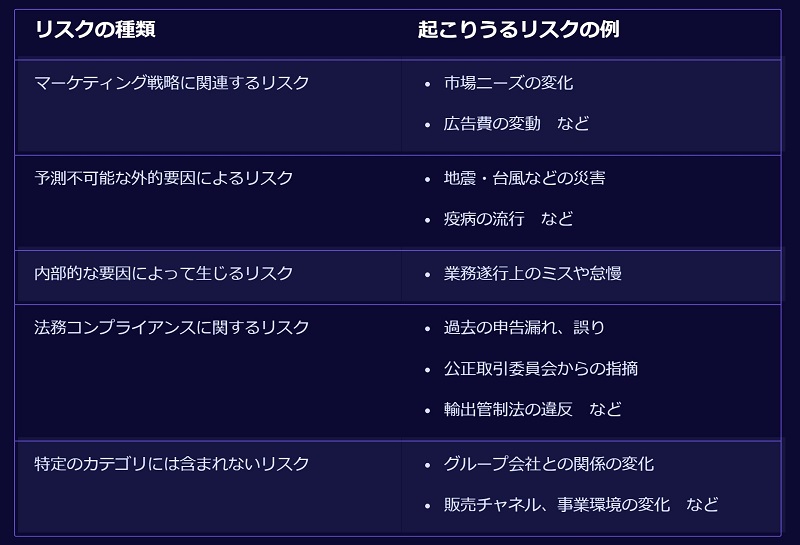 それぞれのリスクを正確に把握し、十分に備えることが重要です。下の図では、それぞれのリスクとして、どのようなものが当てはまるかを分類しているので、参考にしてみてください。