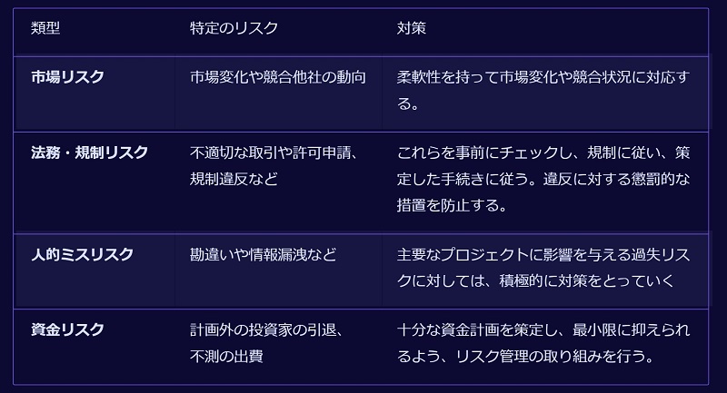 新規事業を開始する際には、これらのリスクをきちんと洗い出し、分析することが重要です。それにより、リスクを回避または低減するための適切な対策を講じることが可能となります。
